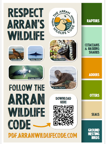 This year inside the front cover of the latest annual bird report for Arran is the front cover and QR code for the Arran Wildlife Code. This code produced under the direction of Megan Hamill is clear and sensible and the Arran Natural History Society is pleased to endorse it in its latest publication the Arran Bird Report 2025. The Arran Wildlife Code, launched in 2025, is a guide for residents and visitors to enjoy the island's nature responsibly, promoting, educating, and relieving pressure on local habitats and species. It encourages observing wildlife from a distance, keeping dogs under control, and respecting nesting and breeding seasons.