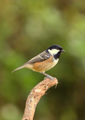 The smallest of the European Tits, Coal Tit tends to get picked on by its larger relatives and is at the bottom of the tit pecking order. When able to get to garden feeders, a Coal Tit will often fly off with a seed or nut, only to return seconds later for another, repeating the action many times. The bird stores the food to eat later. Like a lot of small birds they spend most of the daylight hours feeding, waking early and roosting late.