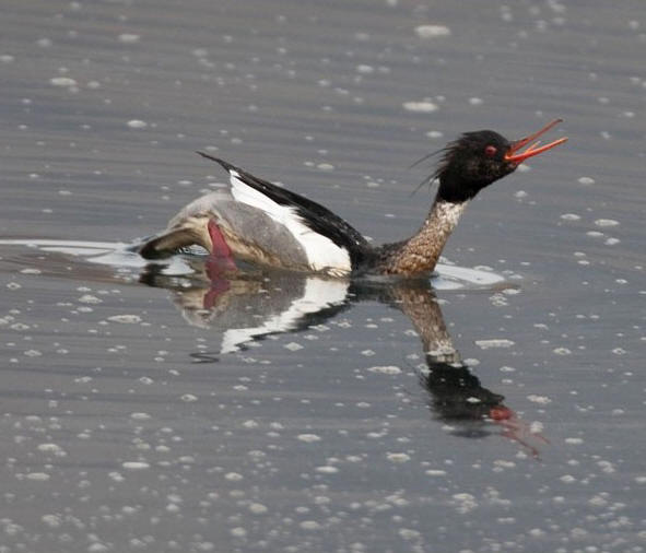 The Goosander is a similar saw-toothed duck. On Arran it is much less numerous than Red-breasted Merganser. This video produced by the British Trust for Ornithology shows the identifying features of Goosander and Red-breasted Merganser. Click.